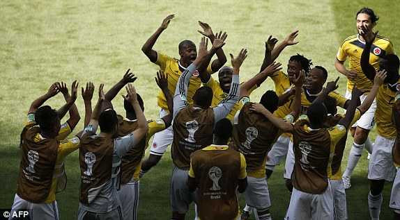 | Niềm vui của các cầu thủ Colombia khi có bàn thắng mở tỷ số. |