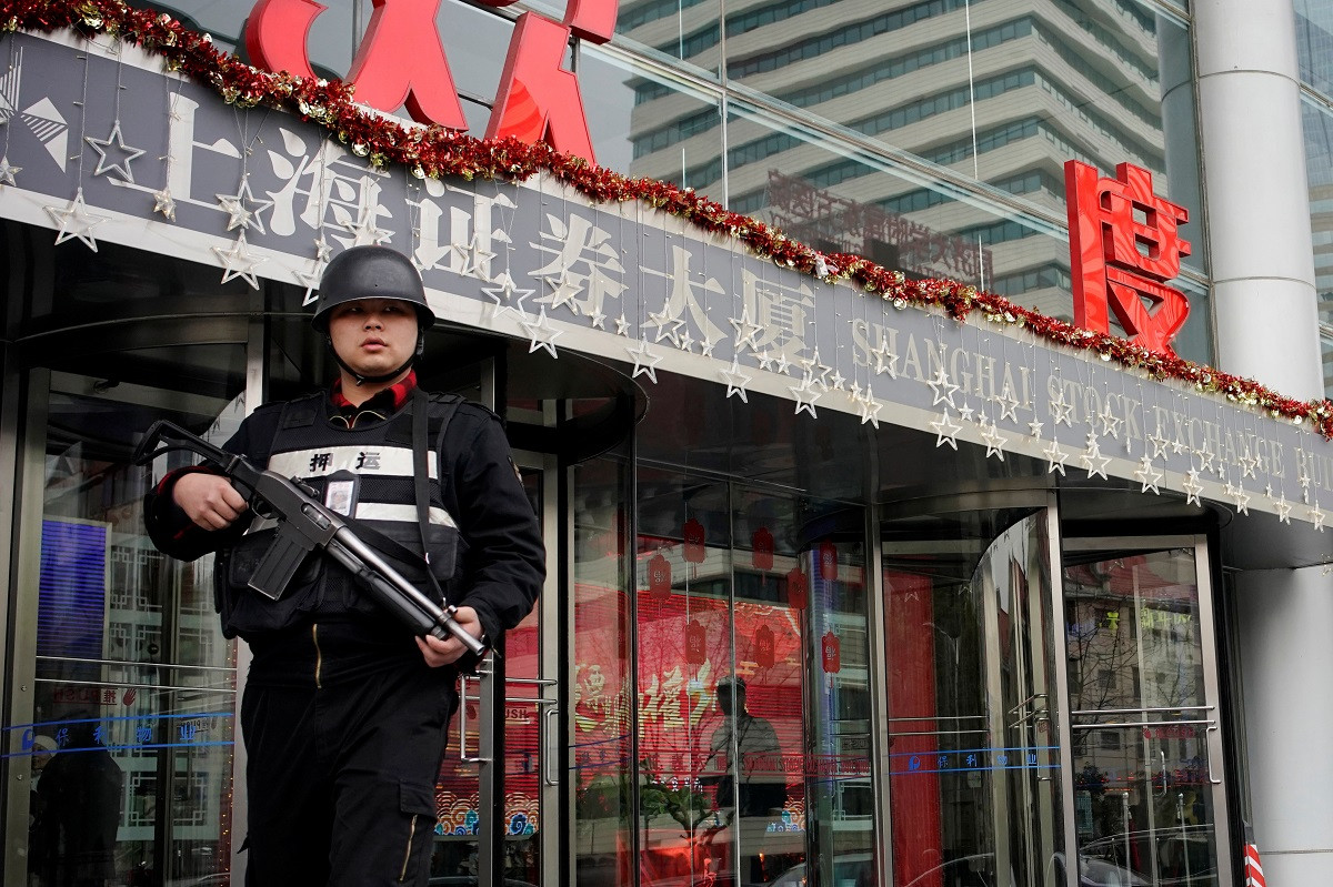 Nhân viên an ninh bên ngoài tòa nhà Sàn giao dịch chứng khoán Thượng Hải ở Phố Đông, Thượng Hải, Trung Quốc. (Ảnh: Reuters)