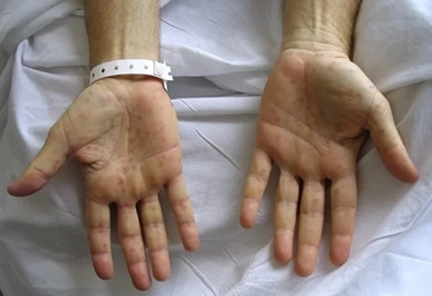Dấu hiệu rõ nhất của bệnh giang mai là các dát đỏ hồng rải rác trên cơ thể. (Ảnh: Cancer Therapy Sdvisor)