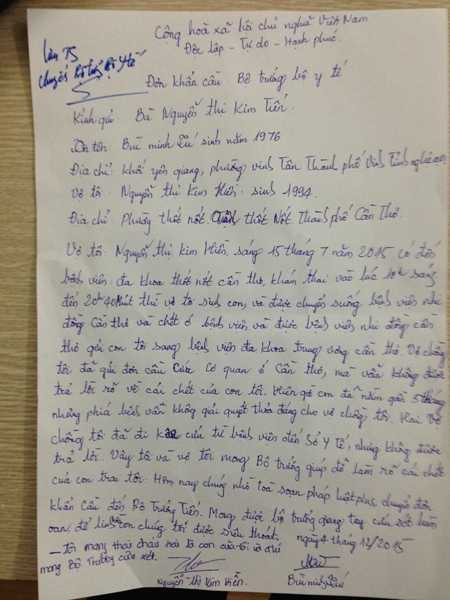Sau gần 5 tháng “đội đơn” đi “gõ cửa” các cơ quan chức năng đề nghị có câu trả lời thoả đáng về cái chết của con mình. Vợ chồng anh Tú, chị Hiền đã gửi đơn khẩn cầu lên Bộ trưởng Bộ Y tế Nguyễn Thị Kim Tiến.