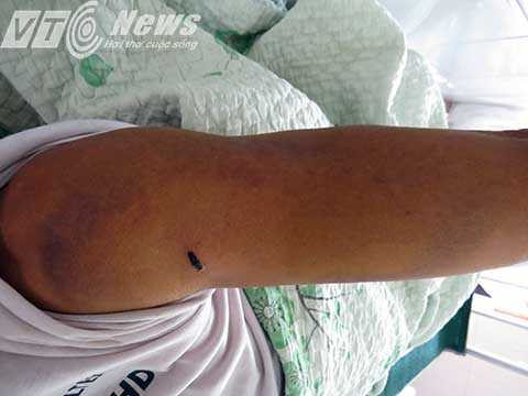 | Cảnh tay ông Đố vẫn bị thâm tím bởi nhóm côn đồ đánh đập - Ảnh MK |