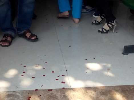 | Vết máu còn vương vãi tại trụ sở ủy ban phường Trung Dũng. Ảnh: PLO |