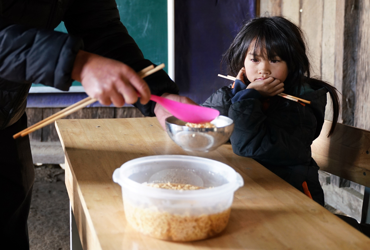 Đứa trẻ này hồi sáng đến lớp không ngồi nổi trên ghế học. Thầy giáo Vàng Văn San tưởng con bị ốm. Hỏi ra mới biết, mấy hôm nay con chưa được ăn gì. Bát mỳ tôm thầy chan, nhiều khi có nước mắt thương trò.