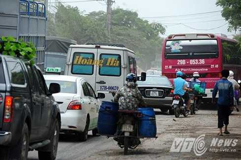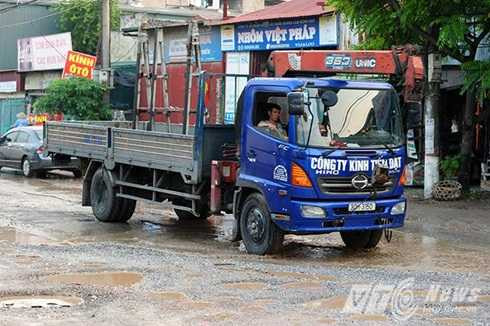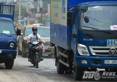 Những đoàn xe tải nối đuôi chạy ì ạch khi qua đoạn ổ trâu, không còn phần đường cho xe máy có thể lưu thông tới. Nhận thấy rõ sự nguy hiểm, nhiều người đi xe máy vội vàng đỗ xe lại, nép vào vỉa hè, đợi đoàn xe tải đi qua mới cố gắng thoát khỏi đoạn đường “đau khổ” này.