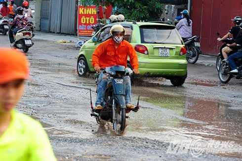Do đường bong tróc tạo thành vũng sâu, nên các xe máy lưu thông qua đây gặp nhiều khó khăn. Người đi đường đã chọn phương án leo lên vỉa hè để tránh các "bẫy" này. Không may chệch tay lái, tai họa có thể ập đến bất cứ lúc nào.