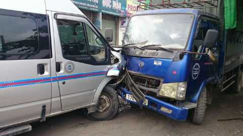Sau cú đâm, chiếc xe 16 chỗ tiếp tục đâm thẳng vào xe tải mang BKS 17K-7080 đang đỗ ven đường khiến hai chiếc xe vỡ nát phần đầu mới chịu dừng lại.