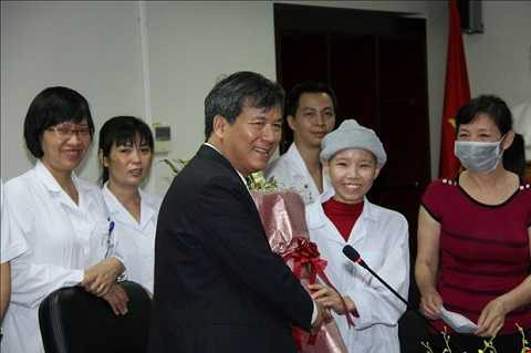 | GS.TS - Anh hùng lao động Nguyễn Anh Trí – Viện trưởng viện Huyết học và Truyền máu Trung ương tặng hoa cho bệnh nhân được ghép tế bào gốc. |