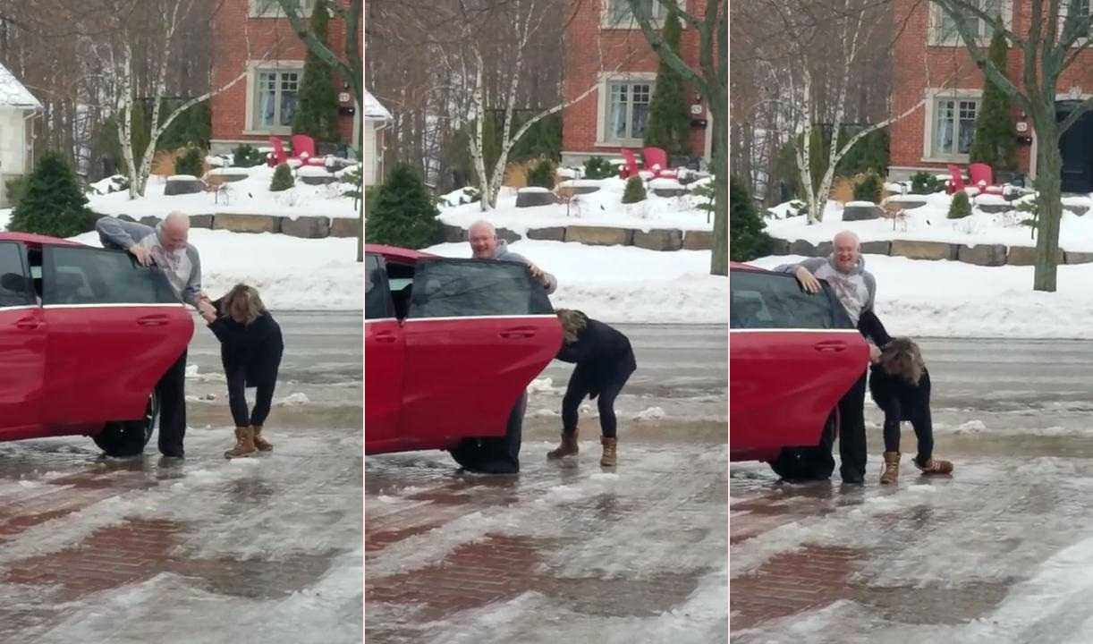 Người mẹ không thể nhịn cười khi thấy cô con gái rượu ngã xoành xoạch trên mặt đường đóng băng trơn trượt.