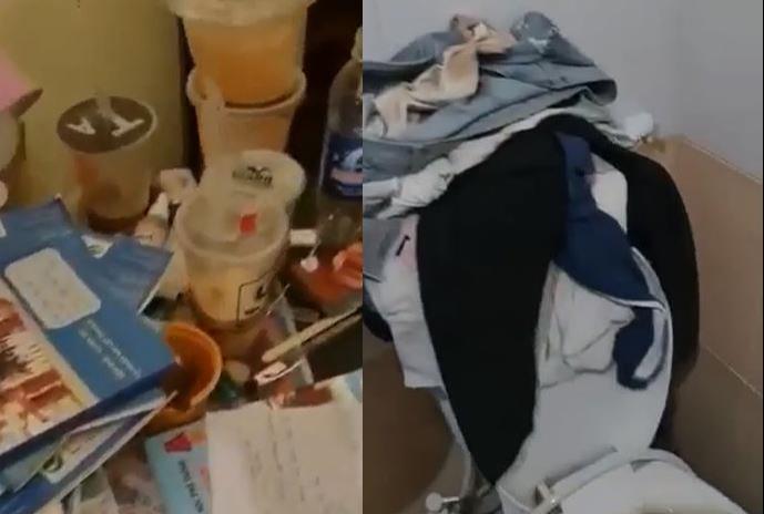 Khung cảnh bừa bộn, bẩn thỉu hiện lên khiến người xem clip phải sốc nặng: Tất cả mọi nơi, kể cả giường ngủ, đều có rác. Trên bàn, sách vở chất đống cùng những hộp trà sữa uống dở. Dưới sàn nhà vương vãi hạt hướng dương, dây điện, máy uốn tóc nằm la liệt. Tủ quần áo không đóng được cửa vì quần áo tràn ra ngoài.