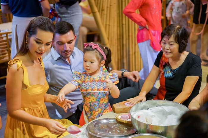 Myla tò mò học làm bánh dẻo hay chơi tò he… đến quên cả sự có mặt của bố mẹ và bà ngoại ở bên cạnh. “Myla bạo dạn hơn rất nhiều so với các bạn cùng trang lứa, chủ động và rất tự nhiên khám phá các trò chơi trong ngày hội này. Nhìn con chững chạc hơn, vợ chồng tôi rất hạnh phúc”, Hà Anh nói.