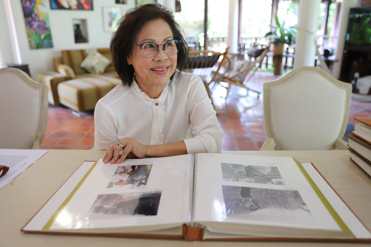 Bà Hiếu Dân với những hình ảnh tư liệu về Thủ tướng Võ Văn Kiệt. (Ảnh: Tỷ Huỳnh)