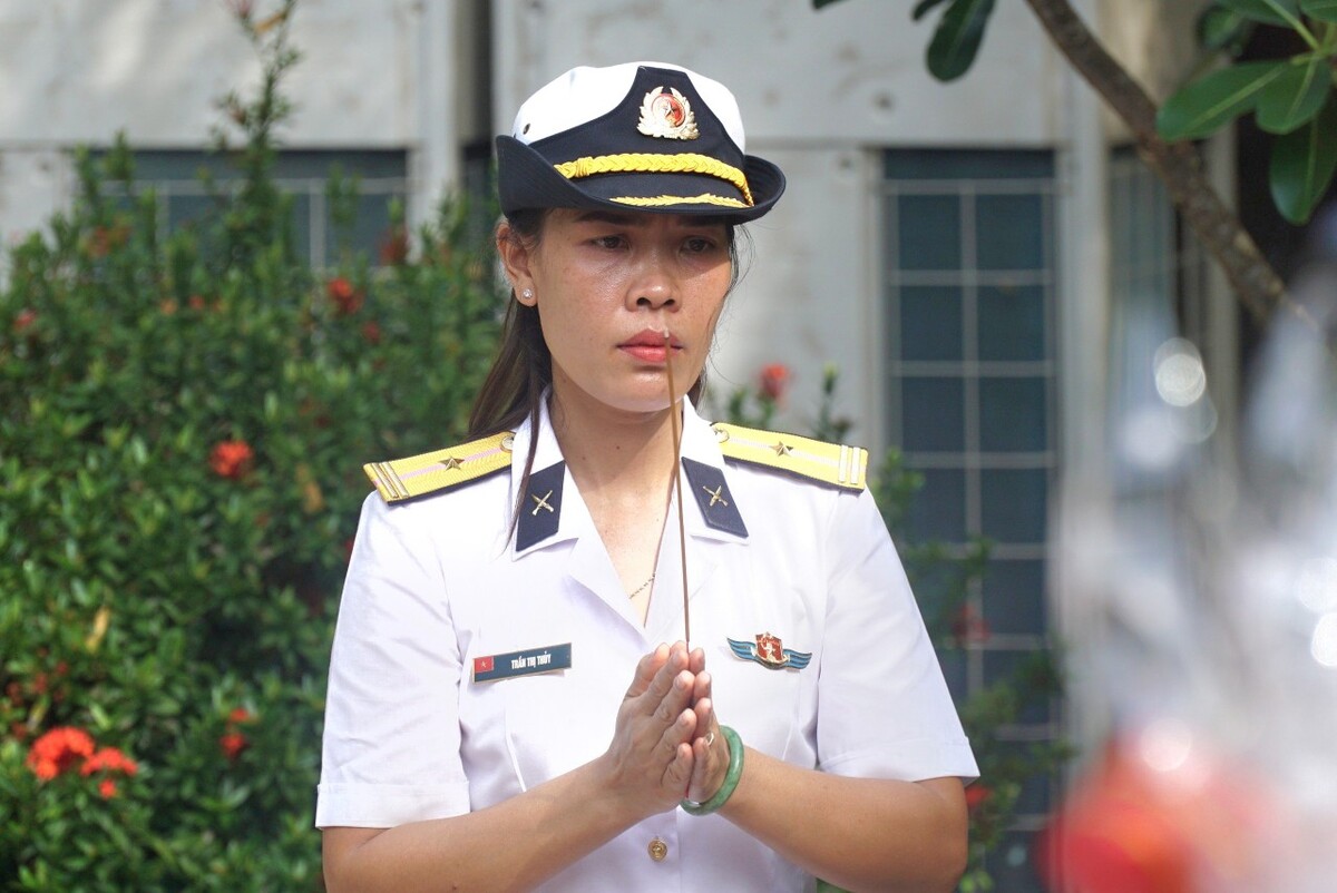 Từ sáng sớm, Thiếu tá Trần Thị Thủy (Lữ đoàn 146, Bộ Tư lệnh Vùng 4 Hải quân) - con gái của liệt sĩ Trần Văn Phương (lúc đó là Thiếu úy, đảo phó Gạc Ma) với bộ quân phục chỉnh tề, đã có mặt tại Khu tưởng niệm Chiến sĩ Gạc Ma.