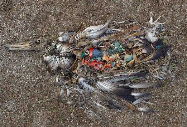| Một con chim biển bị chết do ăn phải quá nhiều nhựa |