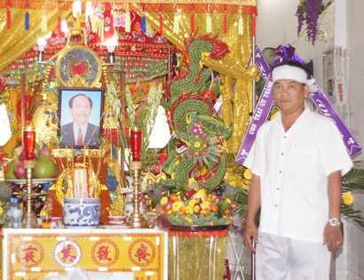 | Anh Bình bên linh cữu bố vợ. |