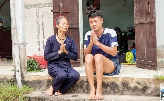 Bà Tới cùng con trai chắp tay cầu xin các mạnh thường quân giúp đỡ gia đình.
