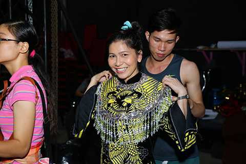 | Sự xuất hiện bất ngờ của Cà Pháo khiến nữ diễn viên rất vui và hạnh phúc. Những mệt mỏi và căng thẳng trong lúc tập luyện đã không còn hiện hữu trên gương mặt cô. Thay vào đó là một nụ cười rạng rỡ khi ngắm nhìn cậu con trai cưng. |