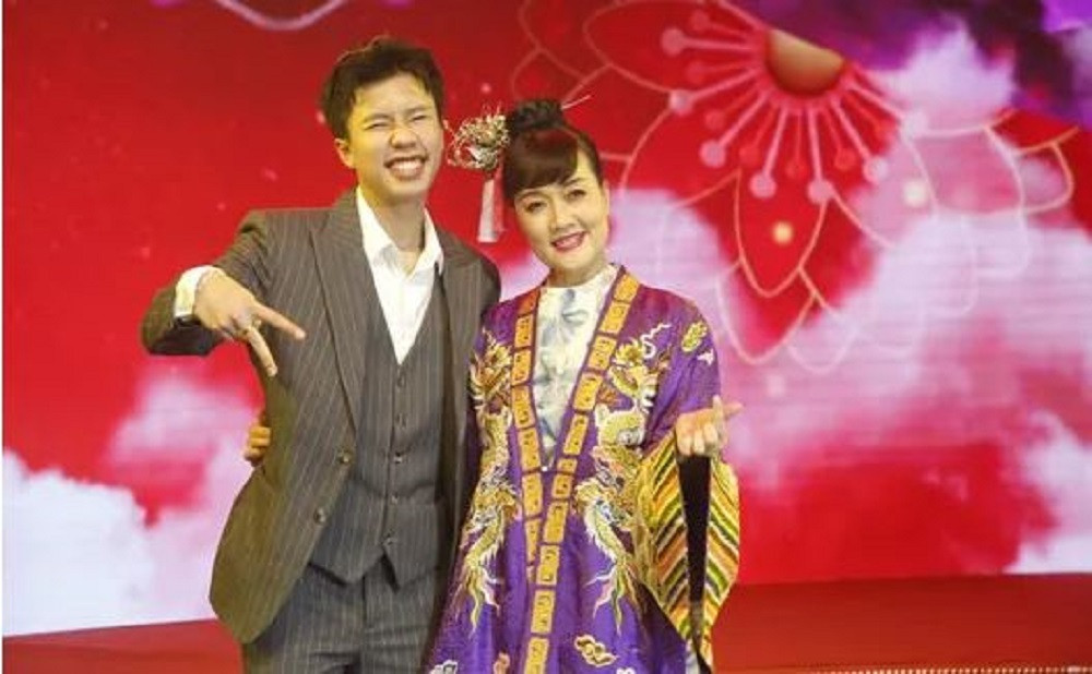 Nghệ sĩ Vân Dung chụp ảnh cùng con trai trên sân khấu Táo quân 2025.