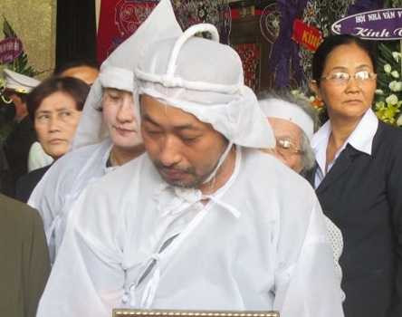 Con trai nhà văn Nguyễn Quang Sáng là đạo diễn Nguyễn Quang Dũng lặng người ôm di ảnh của cha. Không kịp có mặt bên cha trong những phút cuối nhưng Nguyễn Quang Dũng luôn túc trực bên di hài của người cha trong những ngày qua.