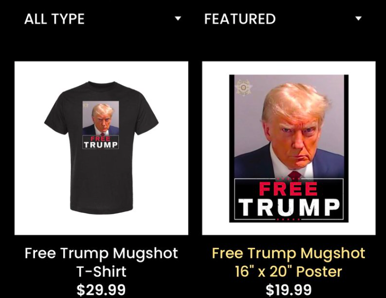 Sau khi Văn phòng Cảnh sát trưởng Quận Fulton công bố bức ảnh hồ sơ tù đầu tiên của một cựu tổng thống Mỹ, con trai ông là Donald Trump Jr. đã đăng thông báo trên X (trước đây là Twitter) về dòng sản phẩm áo phông mới, cốc và áp phích có hình ảnh này cùng với dòng chữ màu đỏ và trắng đậm "trả tự do cho Trump".
