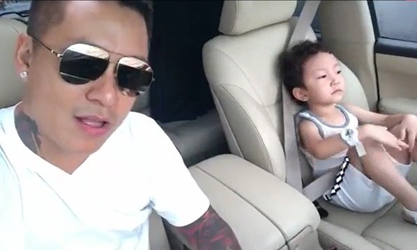 Con trai Tuấn Hưng đeo kính "ngầu" giống hệt bố và hào hứng lắc lư trên xe.