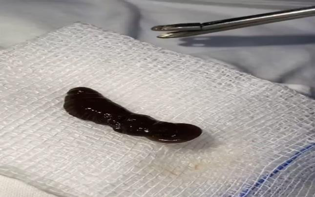 Việc lấy dị vật không thể thực hiện được do cháu bé hoảng sợ nên không hợp tác với nhân viên y tế. Các bác sĩ quyết định cho trẻ nhập viện và tiến hành gây mê để nội soi gắp dị vật. Bằng thiết bị chuyên dụng trong nội soi, các bác sĩ đã kéo từ hốc mũi của bệnh nhi ra ngoài một con vắt có chiều dài lên 4cm.