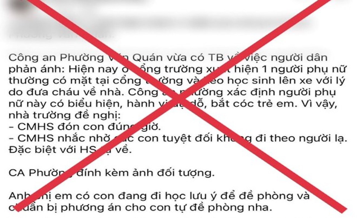 Ngày 21/10, theo thông tin từ Công an TP Hà Nội, Công an quận Hà Đông, thông tin đăng tải trên mạng xã hội về một người phụ nữ có biểu hiện dụ dỗ, bắt cóc trẻ em trên địa bàn phường Văn Quán là sai sự thật, gây hoang mang dư luận, ảnh hưởng đến an ninh trật tự trên địa bàn.