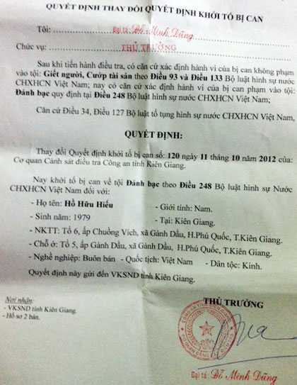 | Quyết định thay đổi tội danh đối với Hồ Hữu Hiếu từ giết người, cướp tài sản sang đánh bạc. Ảnh: T.T. |