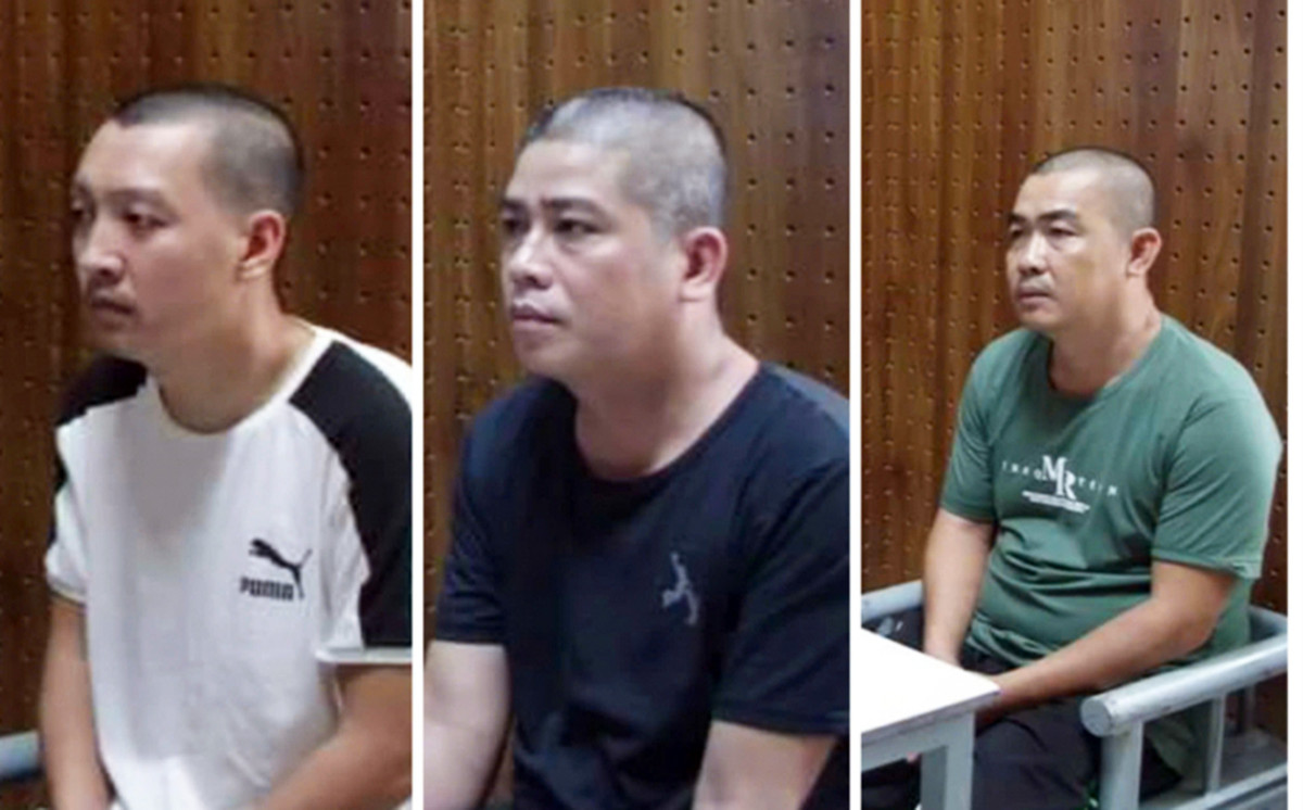 Ngô Anh Khoa, Võ Vũ Lam và Nguyễn Minh Thới tại cơ quan điều tra. (Ảnh: Công an Bến Tre)