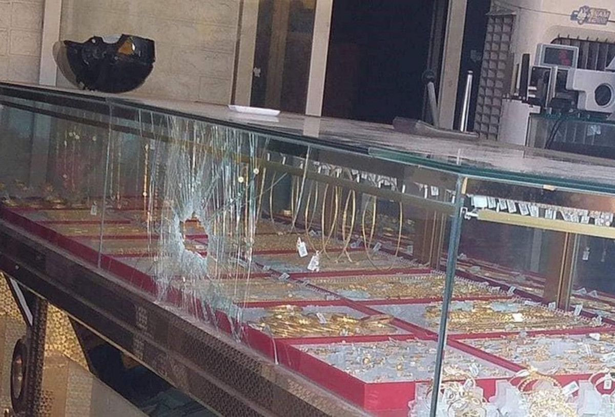 Tủ kính ở tiệm vàng bị thủ phạm đập vỡ và lấy vàng.