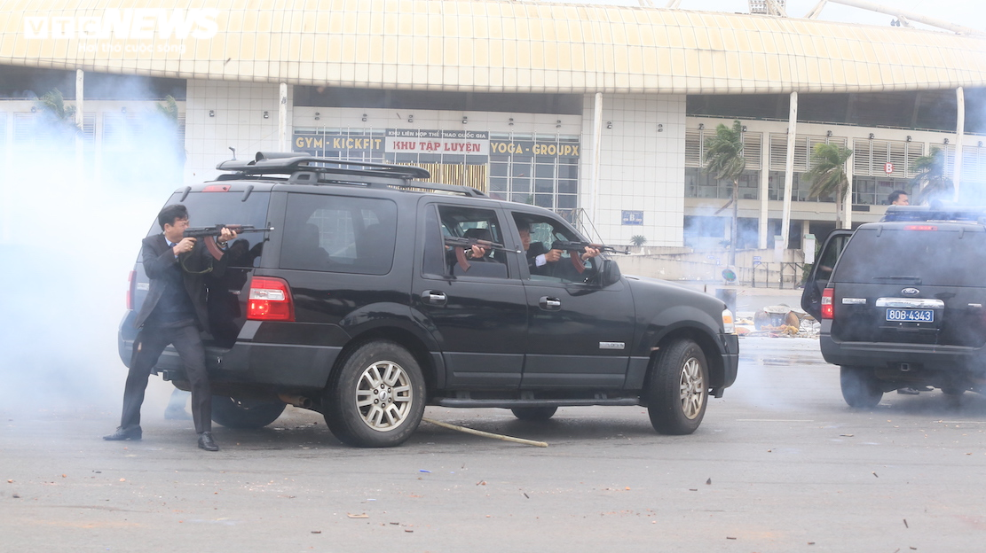 Sau nhiều phần diễn tập của các lực lượng công an, quân đội, lần đầu tiên cảnh vệ diễn tập phương án bảo vệ các khách mời, nguyên thủ.