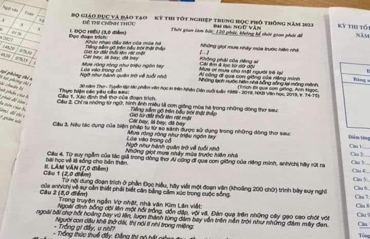 Hình ảnh đề thi môn Ngữ văn thi tốt nghiệp THPT năm 2023 lan truyền trên mạng xã hội vào khoảng 8h ngày 28/6, tức chỉ khoảng 30 phút sau thời gian thí sinh bắt đầu làm bài.