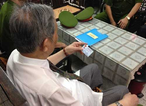 | Cụ Vũ Oanh kiểm tra chứng minh thư mẫu mới |