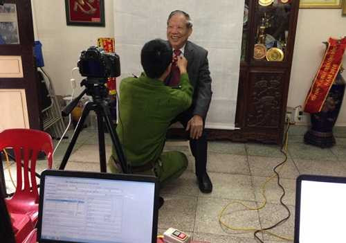 Vừa qua, những thiết bị, máy móc để làm chứng minh thư mẫu mới 12 số đã được các cán bộ chiến sỹ (CBCS) của Đội Quản lý hành chính về trật tự xã hội công an quận Ba Đình (Hà Nội) đưa đến nhà số 14, ngõ 195 phố Đội Cấn, quận Ba Đình của gia đình cụ Vũ Oanh (SN 1924), nguyên Ủy viên Bộ Chính trị để làm CMND cho một số cụ già trong khu phố.