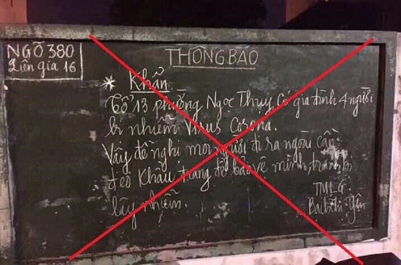 Trước đó, một số hội nhóm Facebook chia sẻ hình ảnh một tấm bảng thông báo ghi nội dung: “Tổ 13 phường Ngọc Thụy, Long Biên có gia đình 4 người bị nhiễm virus corona. Vậy đề nghị mọi người đi ra ngoài cần đeo khẩu trang, tránh lây nhiễm”.