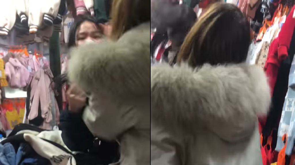Người bán hàng (áo trắng) tát vị nữ khách hàng khi người này mặc cả. (Ảnh cắt từ clip).