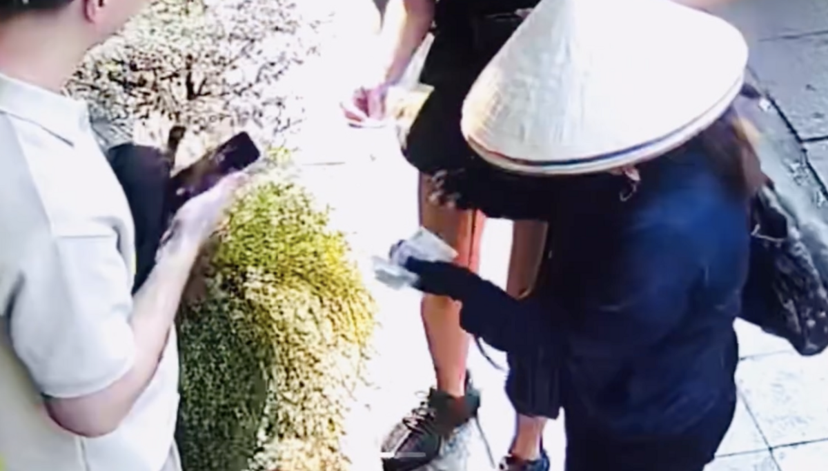 Chiều 11/1, thông qua camera của cơ sở kinh doanh, anh Duy phát hiện 2 khách nước ngoài lời qua tiếng lại với người phụ nữ bán hàng rong. Lúc này, nữ du khách đội chiếc nón lên đầu, sau đó lấy xấp tiền trong túi ra để trả. Thấy vậy, người bán hàng rong nhanh chóng rút 2 tờ 500.000 đồng trên tay khách rồi trả lại 150.000 đồng.