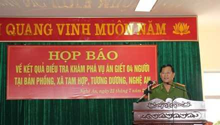 Đại tá Nguyễn Hữu Cầu - giám đốc Công an tỉnh Nghệ An chủ trì cuộc họp báo. Thiếu tướng Hồ Sỹ Tiến - Cục trưởng Cục Cảnh sát hình sự (C45, Bộ Công an) và các thành viên Ban chuyên án cũng có mặt tại trụ sở Văn phòng Cơ quan cảnh sát điều tra Công an tỉnh Nghệ An.