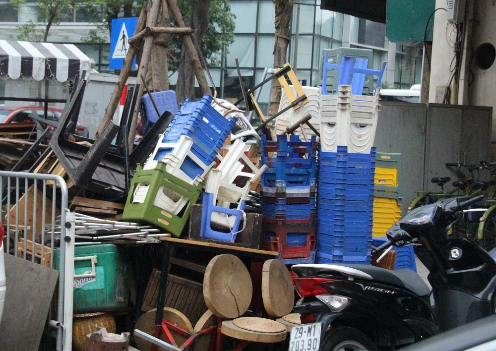 Nhiều 'tang vật' lấn chiếm vỉa hè bị tạm giữ xếp chồng chất ngay trước trụ sở Công an phường Lý Thái Tổ (quận Hoàn Kiếm, Hà Nội). (Ảnh: Tùng Lâm)