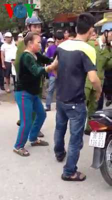 | Sau khi được buông ra và người dân vào can ngăn, nam thanh niên (áo vàng đen) bị ôm cổ đứng lên |