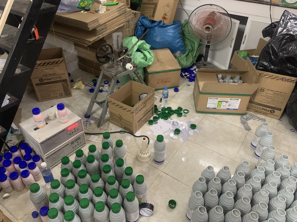 Để sản xuất thuốc bảo vệ thực vật giả dạng lỏng, Giác dán tem, nhãn giả lên vỏ chai nhựa sau đó chế dung dịch lỏng giả thuốc bảo vệ thực vật vào rồi niêm phong seal giả lên miệng nắp chai, đóng nắp và xếp vào thùng carton.