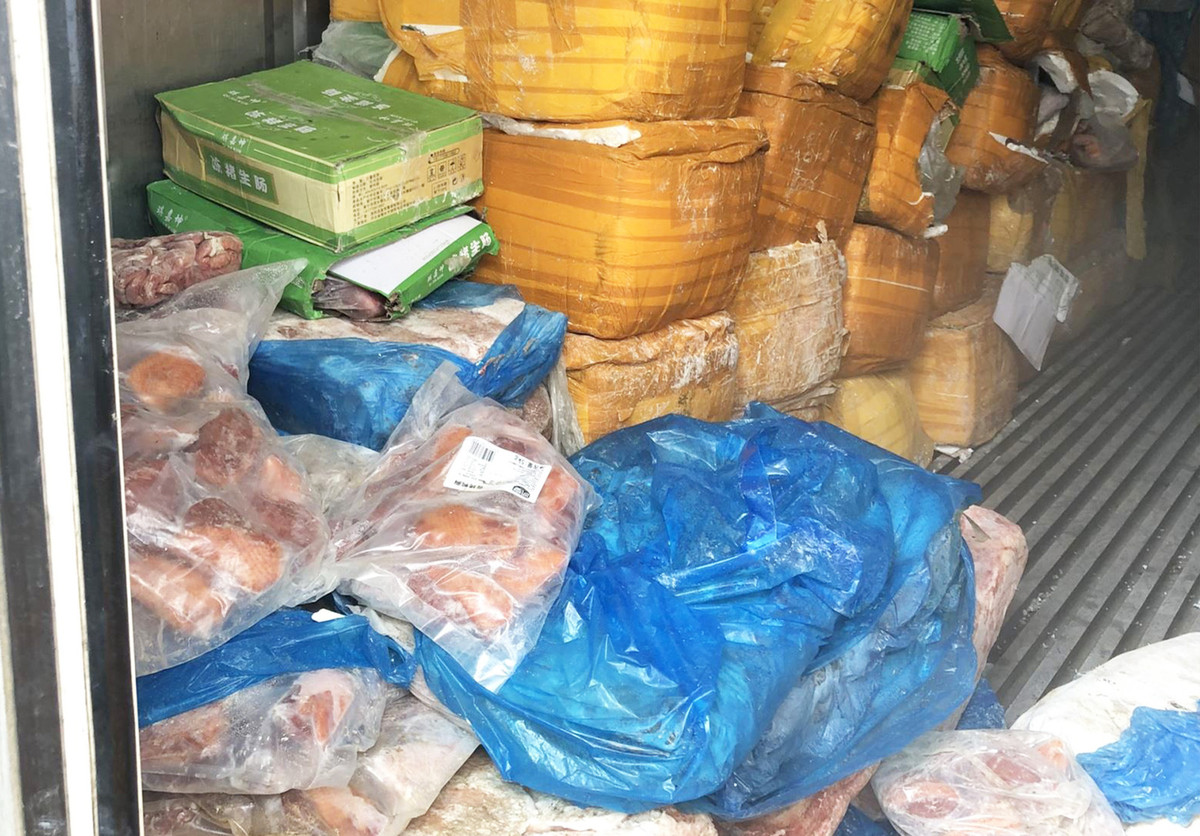 Cơ quan chức năng phát hiện hai thùng container lạnh chứa thực phẩm không rõ nguồn gốc, xuất xứ. (Ảnh Công an cung cấp)