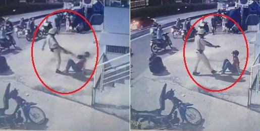Khi 2 thanh niên này ngồi xuống đất thì bị chiến sĩ CSGT đá vào mặt nên ngã ngửa. Tiếp đó, chiến sĩ này còn rút súng ra trước mặt dọa người vi phạm.