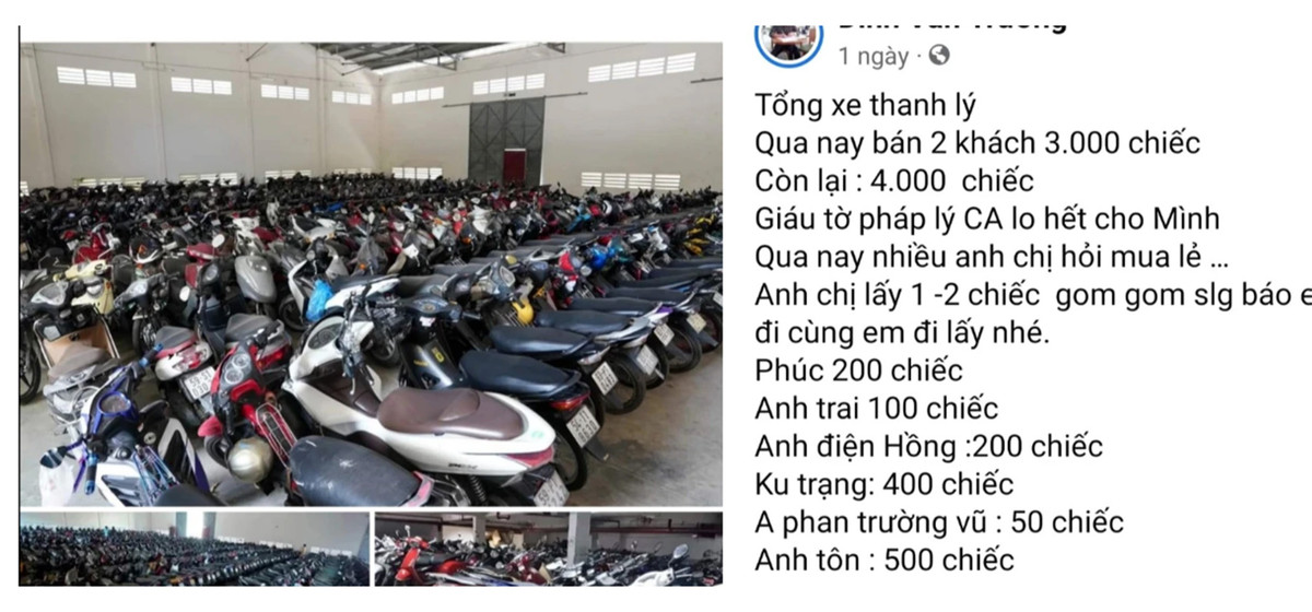 Người này còn quay video, chụp ảnh đăng lên trang cá nhân rao bán "7.000 xe thanh lý" sai sự thật khiến nhiều người hiểm lầm trong khi cả kho chỉ có khoảng 1.000 xe.