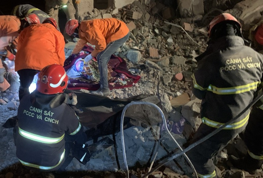 Một ngày trước, qua hệ thống camera, lực lượng chức năng 2 nước đã xác định được 3 thi thể trong đống đổ nát. Lực lượng cứu hộ Việt Nam nhanh chóng đưa các thiết bị hiện đại vào để đào bới bê tông, đưa các nạn nhân ra bên ngoài.