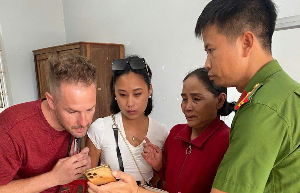 Chị Kim Hồng cùng chồng người Pháp đến Công an xã Hòa Hiệp, huyện Xuyên Mộc để trình bày sự việc, nhờ tìm người thân.