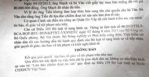 | Kết luận của Cơ quan CSĐT công an quận Gò Vấp về vụ bà Vân tố cáo "hiệp sỹ" Minh Tiến lừa đảo đất đai. Ảnh: Phan Cường |