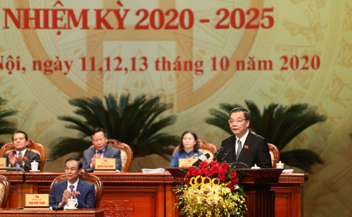 Ông Chu Ngọc Anh - Ủy viên Trung ương Đảng, Phó Bí thư Thành ủy khóa XVI, Chủ tịch UBND TP Hà Nội báo cáo kết quả Hội nghị lần thứ nhất Ban Chấp hành Đảng bộ TP Hà Nội khóa XVII nhiệm kỳ 2020-2025.
