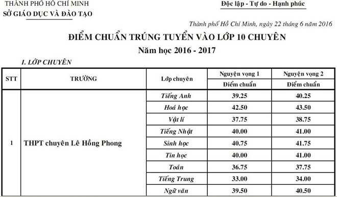 Điểm chuẩn vào lớp 10 chuyên tại TP.HCM năm 2016 tại đây:
