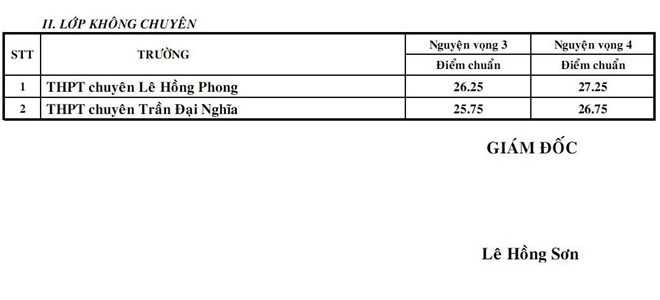 Ở khối trường chuyên, Trường THPT chuyên Lê Hồng Phong có điểm chuẩn cao nhất như lớp chuyên Hóa NV1 là 42,5 điểm, NV2 là 43,5 điểm; lớp chuyên Sinh NV1 là 40,75 điểm, NV2 41,75 điểm...