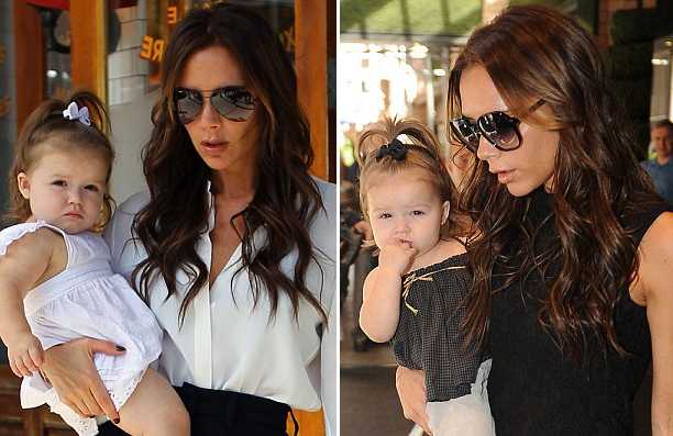 Mái tóc của con gái nhà Beck đã khá dài và có thể tạo kiểu dễ thương, mỗi lần ra phố mẹ Vic lại không quên làm điệu cho cô công chúa này. Mái tóc mượt như tơ được đeo thêm chiếc bờm làm điệu, Harper Beckham diện bộ váy xòe cực thời trang. Trông cô bé thật mũm mĩm và đáng yêu, vậy mà mẹ Victoria vẫn có thể một tay bế con, một tay xách túi trên đôi giày cao gót lênh khênh.